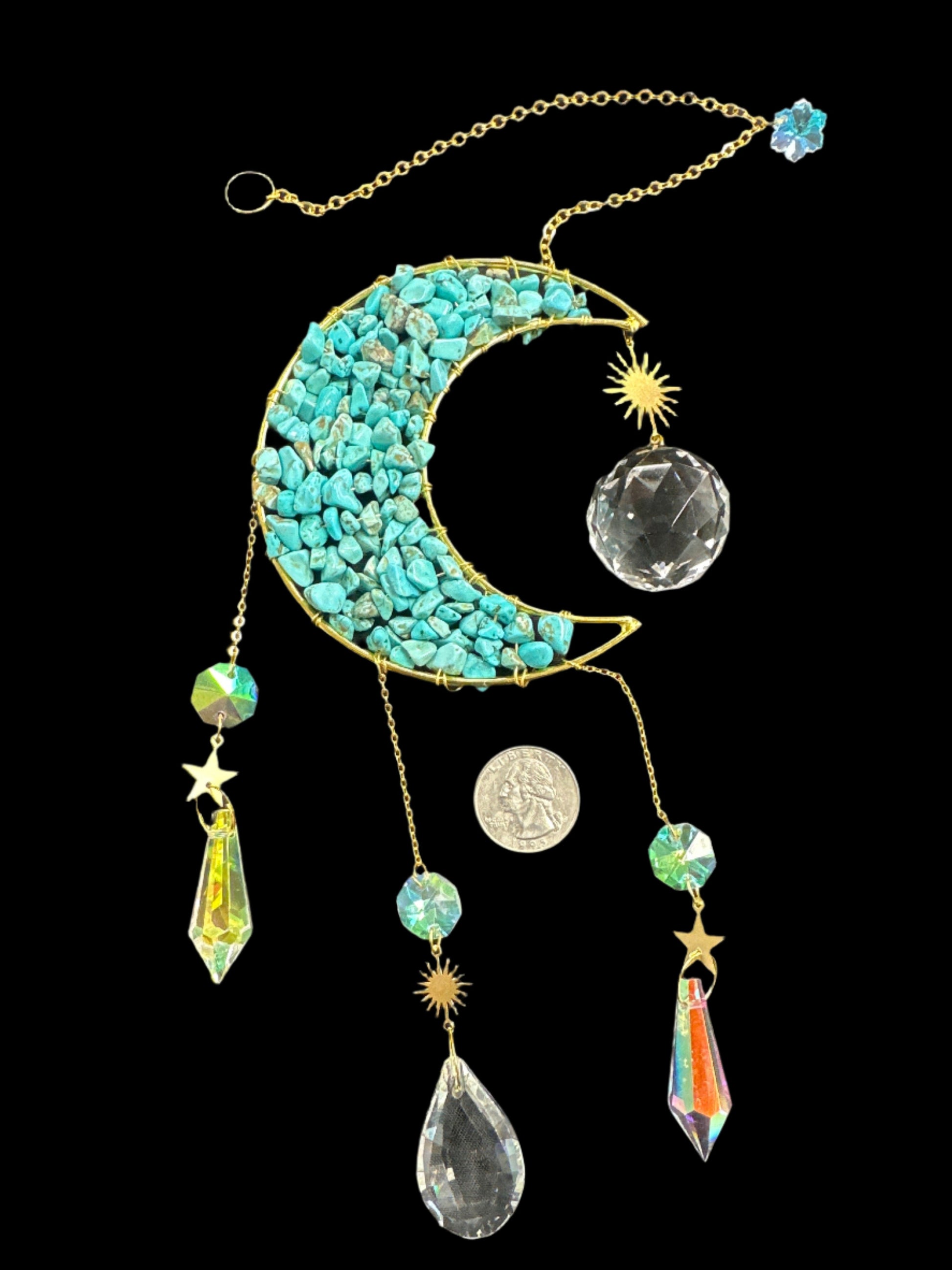The crescent shape of this Moon Suncatcher is an enduring symbol of the divine feminine. An homage to the celestial body that governs the flow of the tides. This light catcher crystal design represents new beginnings leading to constant growth and change. These Crystal Moon Suncatchers can harness energy from the sun and spread it throughout your home.